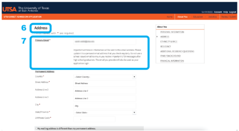 Note: If you need to complete your application later, we encourage you to complete the “Personal Information” and “Address” sub-sections to ensure your email is updated. The next time you log in, you’ll edit your “UT San Antonio Direct” application.
